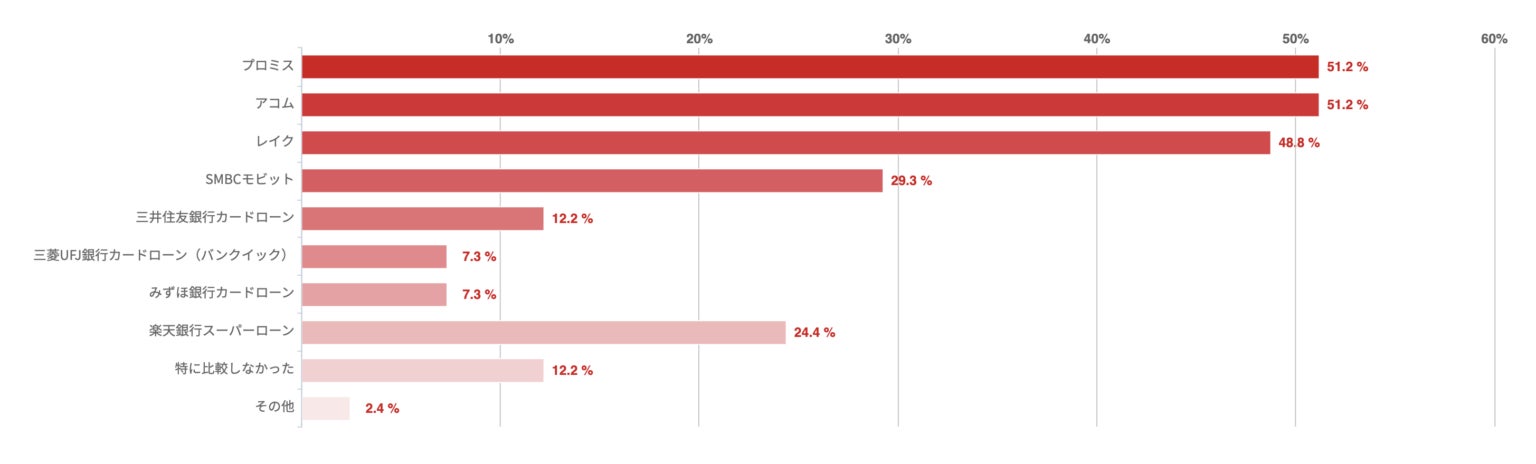 SMBCモビットと同じ大手の消費者金融を比較対象としている人が多かった。SMBCモビットで即日の借入を検討している人が、他の消費者金融の審査スピードや手続きの利便性などを比べていると考えられる。