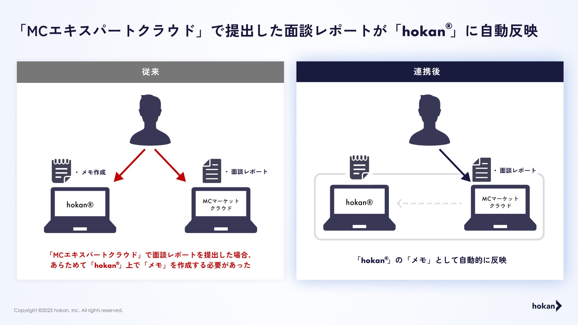 従来:MCエキスパートクラウドで面談レポートを提出した場合、あらためて「hokan®︎」上で「メモ」を作成する必要がありました。