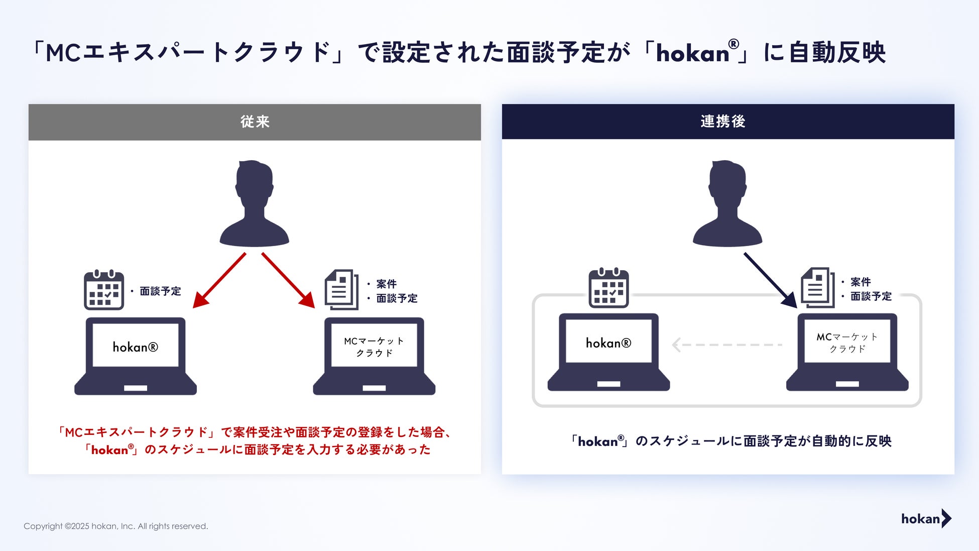 従来:MCエキスパートクラウドで案件受注や面談予定の登録をした場合、あらためて「hokan®︎」のスケジュールに面談予定を入力する必要がありました。