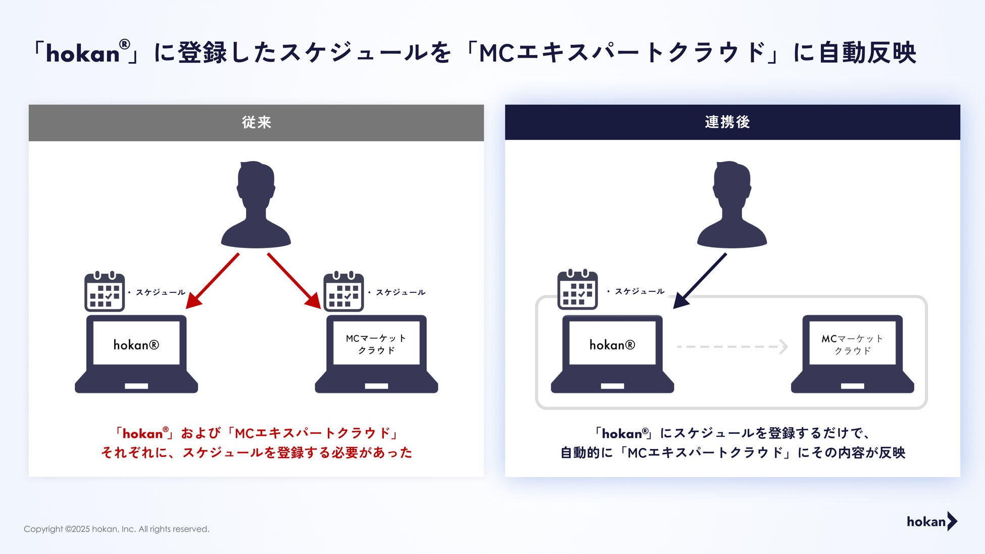連携後:募集人の方は、「hokan®︎」にスケジュールを登録するだけで、自動的にMCエキスパートクラウドにその内容が反映されます。