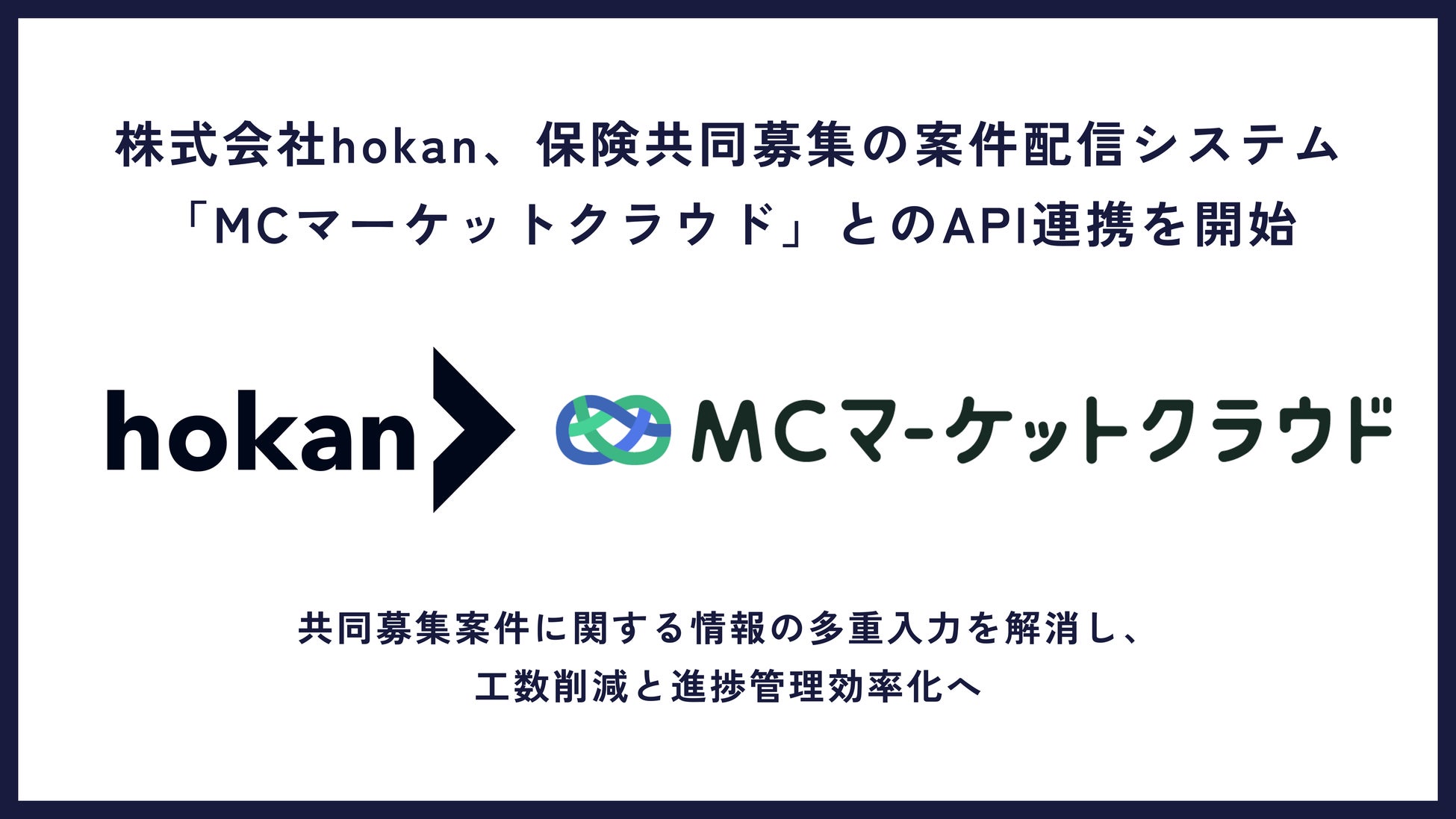 「適正な営業活動」と「組織の強固な監査体制」を実現するクラウド型保険代理店システム「hokan®︎」を提供する株式会社hokan(ホカン、本社:東京都中央区、代表取締役共同社長:小坂直之、横塚出、以下:当社)は、株式会社Wizleap(ウィズリープ、本社:東京都渋谷区、代表取締役:谷川昌平)が提供する保険共同募集の案件配信システム「MCマーケットクラウド」とのAPI連携機能をリリースいたしました。本連携により、「hokan®︎」および「MCマーケットクラウド」双方における共同募集の案件管理が効率化され、保険代理店の業務負担軽減と営業活動の適正化が促進されます。