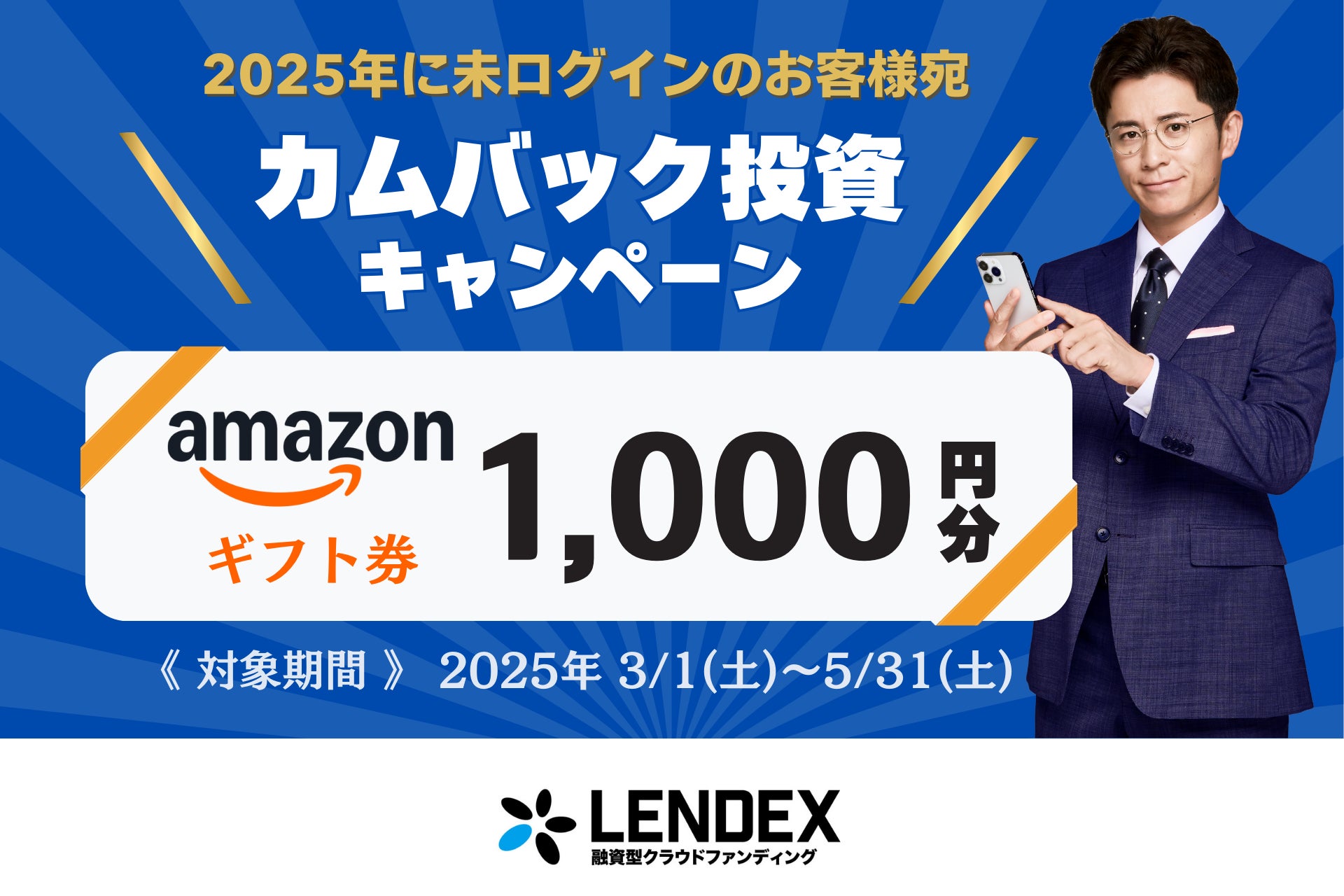 この度、融資型クラウドファンディング「レンデックス(LENDEX)」を運営する株式会社LENDEX(本社:東京都渋谷区、代表取締役:中村 智)は、【カムバックキャンペーン】を2025年3月に開始したことをお知らせします。