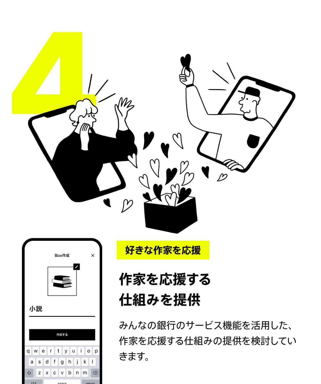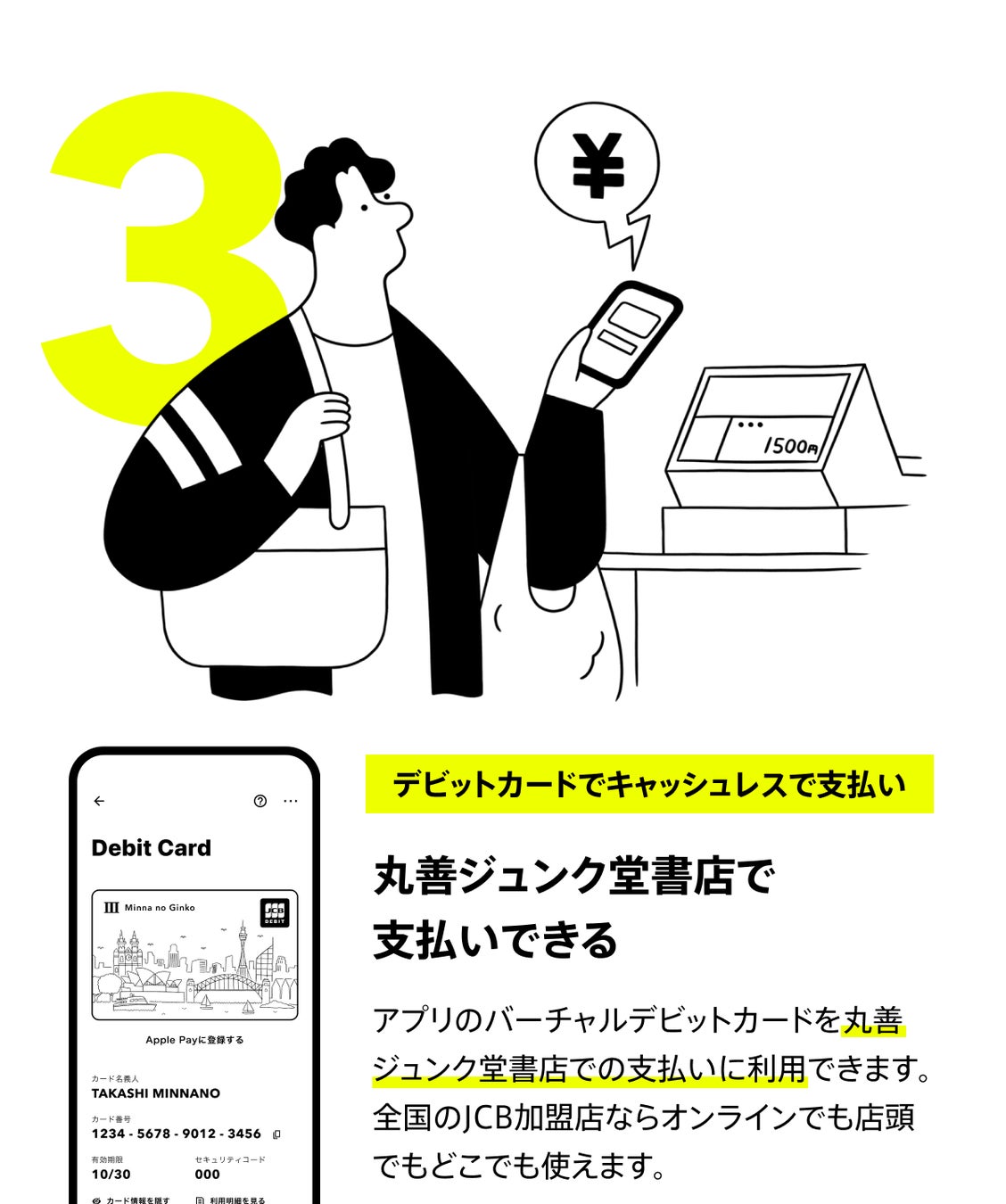 まずは、「丸善ジュンク堂支店(仮称)」を、みんなの銀行内に新設し、みんなの銀行が提供するスマートフォン専用アプリを通じて、丸善ジュンク堂書店のお客さま向けオリジナル銀行サービスの提供に向けた協議を進めます。