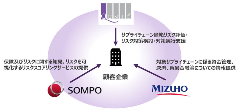 みずほ銀行とクニエに加え、損保ジャパン、SOMPOリスクの4社は、サプライチェーン途絶リスクに対する分析から対策方針・目標策定から具体施策の立案、実行に至るまで、それぞれの強みを活かし、お客さまの課題対応に貢献します。