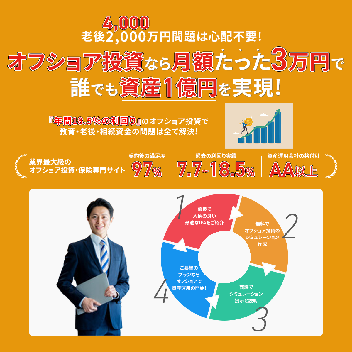 「オフショア」という言葉は少し聞き慣れないかもしれませんが、簡単に言うと、海外で運用される保険のことです。これにより、通常の保険では得られない高い利回りを期待できるのが大きな特徴です。[マイプロパティ]のオフショア貯蓄型生命保険は、年利回り10%以上を見込める運用実績があり、資産を安定的に増やすことができます。