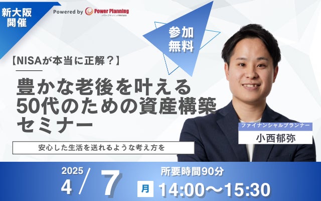 4月7日(月)14時より人気講師、小西郁弥氏による「≪NISAが本当に正解?≫まだ間に合う! 豊かな老後を叶える50代のための資産構築セミナー」を開催いたします。