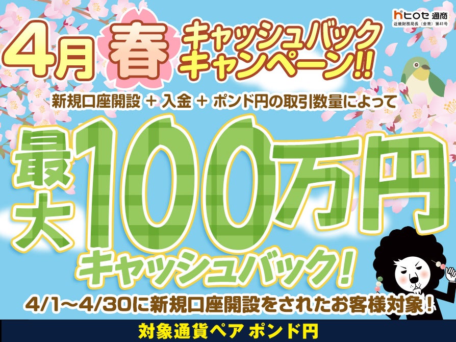 ヒロセ通商株式会社 (本社:大阪府西区、代表取締役:野市 裕作、以下:当社)は、当社の提供する「LION FX」において、2025年4月1日(火)より、「4月春最大100万円キャッシュバックキャンペーン!」を実施いたしましたのでお知らせいたします。
