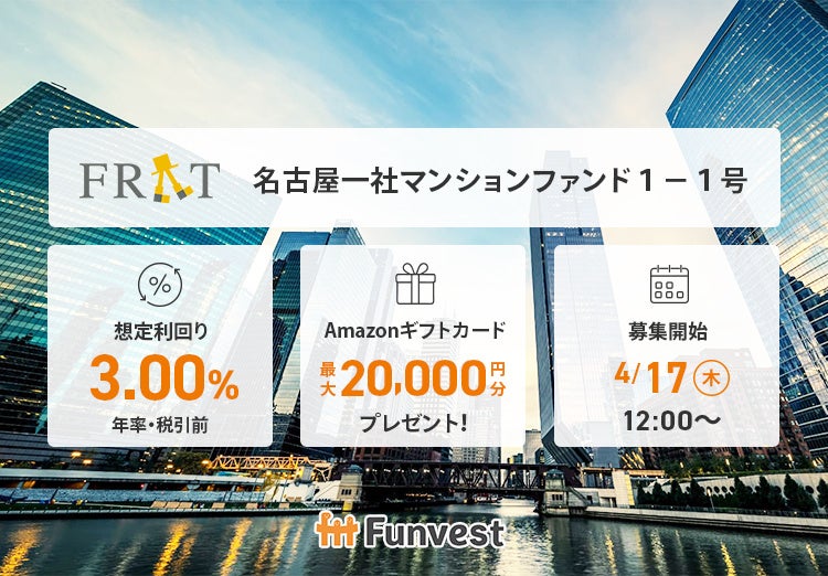 「未来をわかちあう投資」を提供する「Funvest(ファンベスト)」(以下、Funvest)は、「FRAT 名古屋一社マンションファンド1-1号」(以下、本ファンド)の募集を4/17より開始しますので、お知らせいたします。