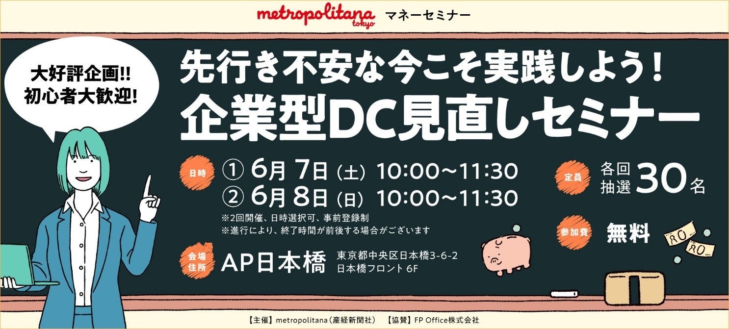 メトロポリターナ(産経新聞社発行)は、資産運用などに興味がある人を対象に「先行き不安な今こそ実践しよう! 企業型DC見直しセミナー」を東京都中央区のAP日本橋で6月7日(土)、8日(日)の各日午前10時からそれぞれ開催し、参加者を募集します。