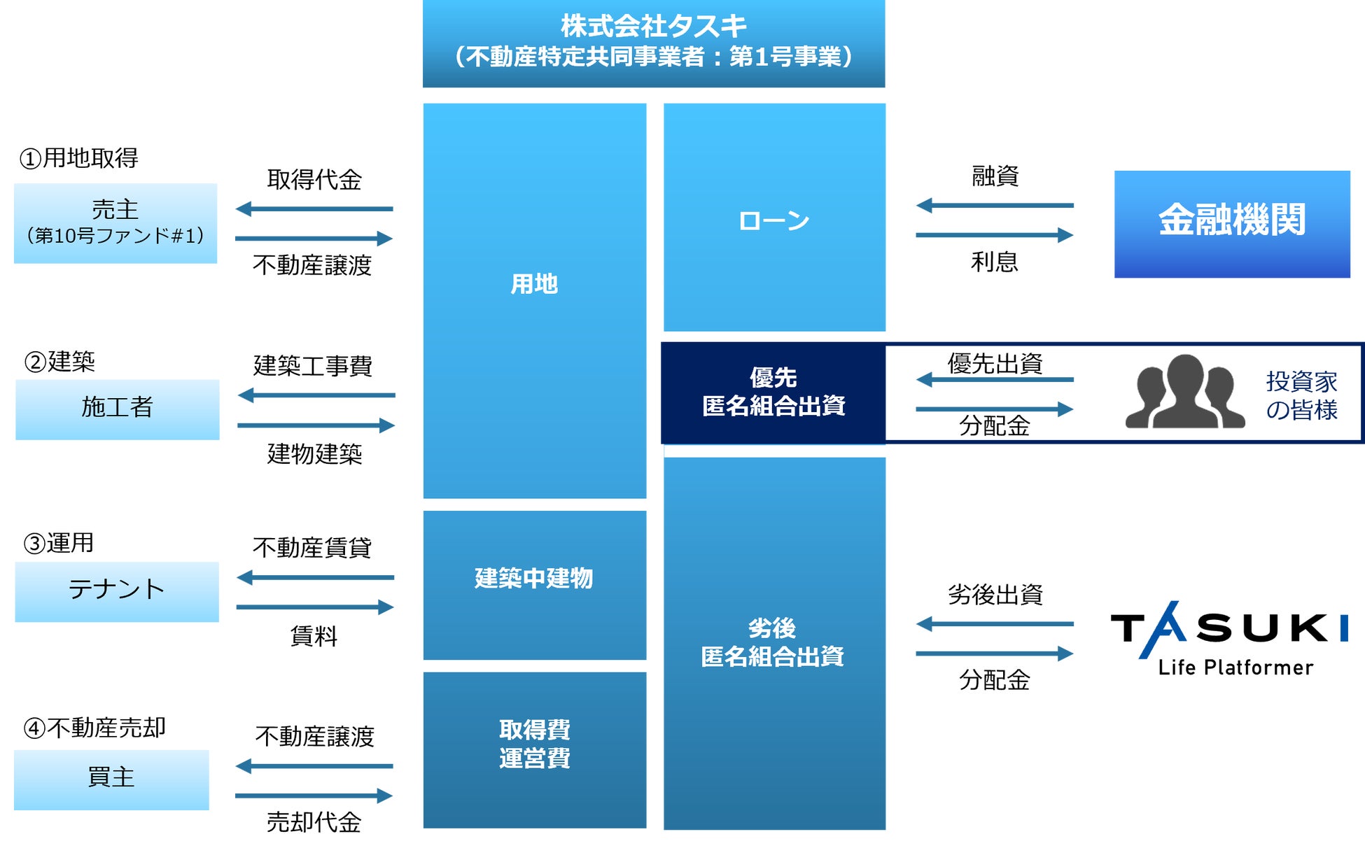 本ファンドは、用地の取得から建築確認済証の取得・着工までを運用期間としているファンド「タスキ キャピタル重視型 第10号ファンド#1」の次フェーズとして、着工から竣工までを運用期間とするスキーム「タスキ キャピタル重視型 第10号ファンド#2」を組成するものです。同一物件に対し、プロジェクトの進行度合いによる事業リスクの程度に応じて段階的にクラウドファンディングを組成し、投資家のみなさまの新たな投資機会の創出と、資金流動性の向上を図ります。