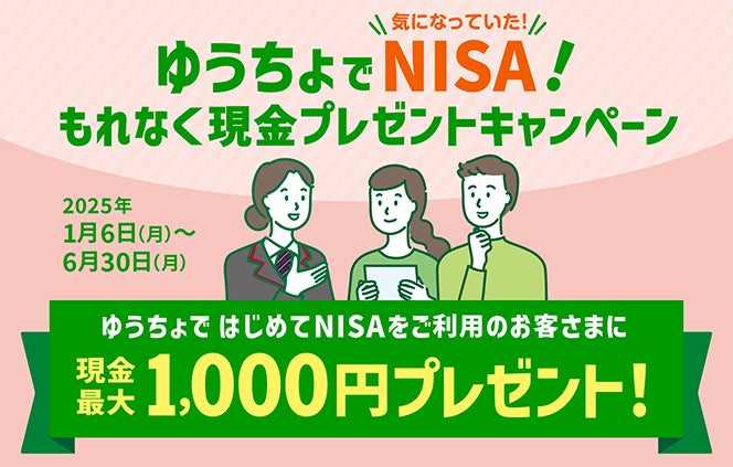 2025年6月30日(月)まで、はじめてNISA口座をご利用いただく方を対象に、最大1,000円をプレゼントする「ゆうちょでNISA!もれなく現金プレゼントキャンペーン」を実施中です!