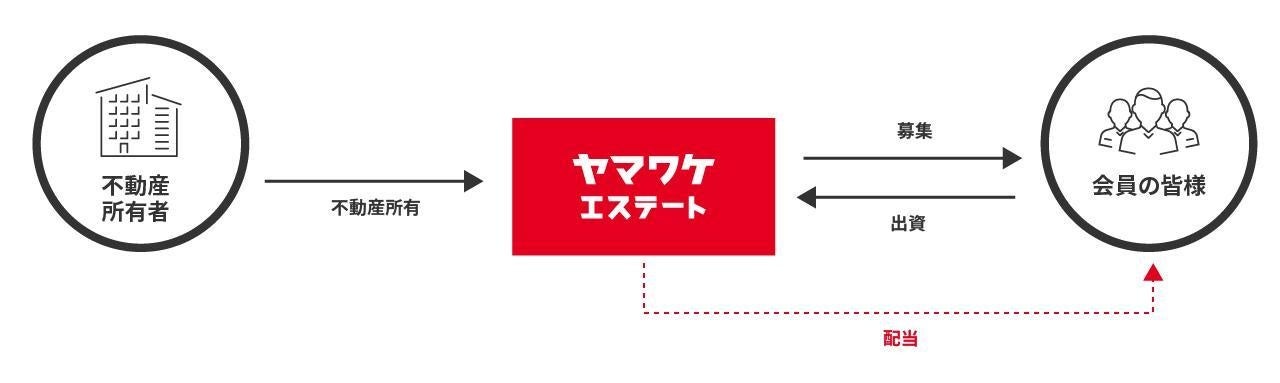 不動産特定共同事業法(第1号・第2号)に則り、ヤマワケエステート株式会社が土地やビルなどの不動産物件を取得または賃貸借等して運用し、得られた利益の一部を投資家に配当として還元いたします。