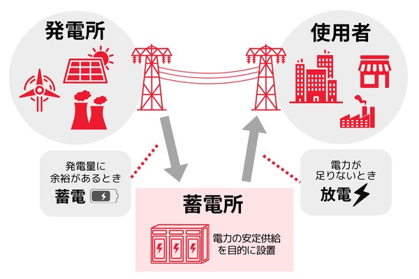 蓄電池は、電気エネルギーを一時的に貯蔵し、必要なときに放電して利用できる装置です。「系統用蓄電池」は、発電設備なしで系統(発電所から家庭や工場に電気を供給するための設備)と接続でき、需給バランスを調整するインフラとして機能します。