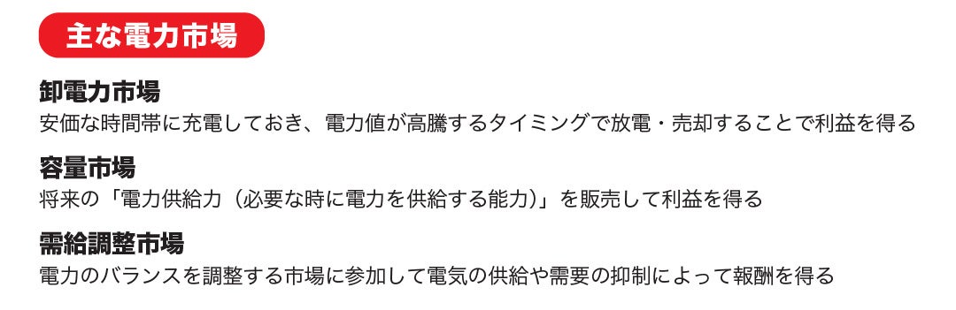 2021年の電気事業法改正により、1万kW以上の蓄電所は「発電所(発電事業)」として認定されました。従来の卸電力市場に加え、容量市場や需給調整市場が形成され、系統用蓄電池は「電気をためて売る発電所」として、新たなビジネスモデルとして大きな可能性を秘めています。