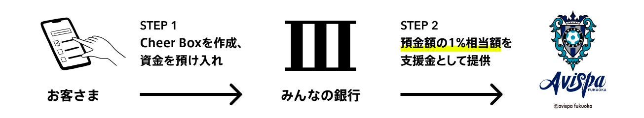 「アビスパ」の4文字を含む名前を付けたCheer Boxにお金を預けていただくことで、応援する皆さまに代わって、みんなの銀行がCheer Boxに集まった預金残高の1%相当を支援金としてアビスパ福岡にお届けします。なお、本支援金は、2025年10月に予定している「OB戦」の開催費として使用されます。