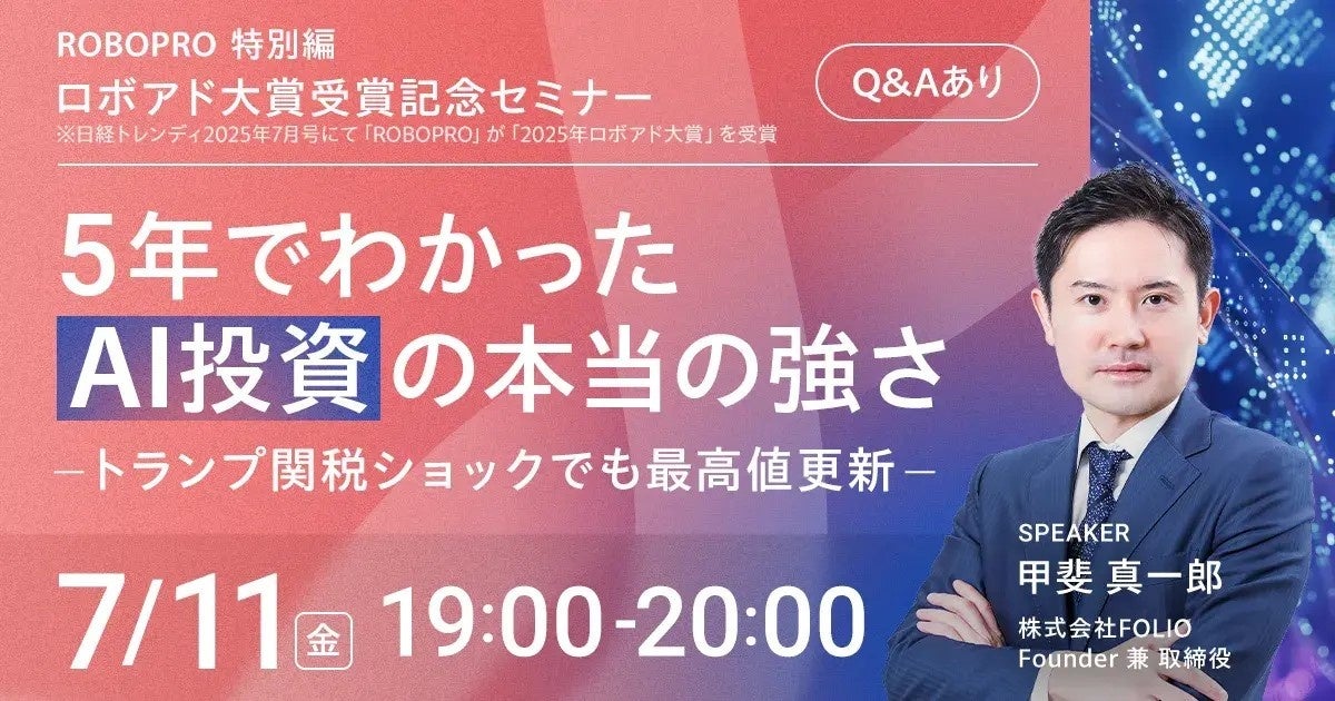この度開催する特別セミナーでは、FOLIO創業者である甲斐が講師を務め、トランプ関税ショックによる株価の下落など、波乱に満ちた市況の中で、「ROBOPRO」がどのような投資戦略を採り、これらの相場を乗り越えてきたのかを実績をもとにご説明します。ご関心ある方はぜひ本セミナーにご参加ください。