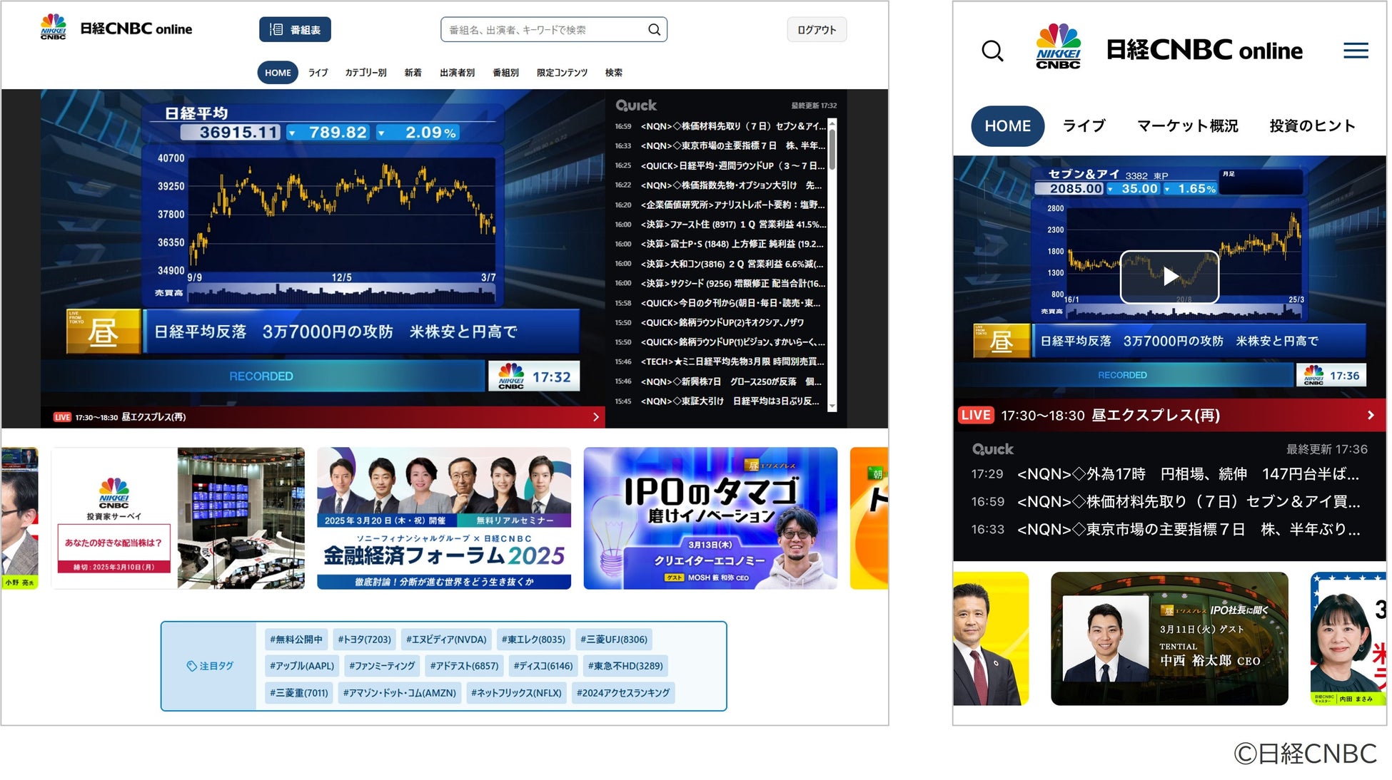 東京市場の動きを実況中継、海外市場の動きも速報し、多彩なゲストが今後のマーケットの動きを解説します。注目上場企業のトップやIPO企業の経営者が連日生出演するほか、日銀やFOMCなどの重要会見もライブ配信しています。