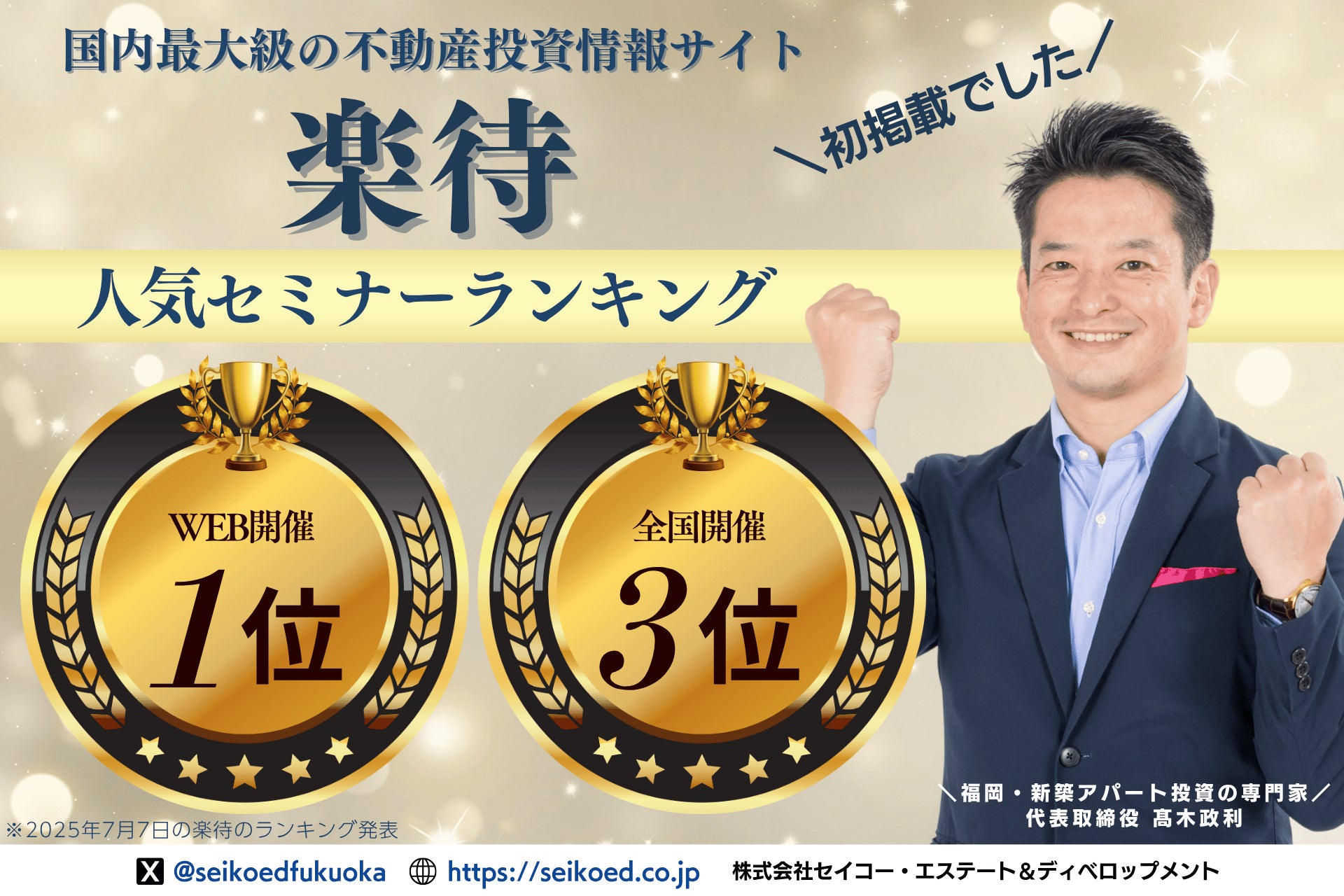 株式会社セイコー・エステート&ディベロップメント(本社:福岡市、代表取締役:髙木政利)は、2025年7月12日開催の無料不動産投資セミナーが、国内最大級の不動産投資情報サイト「楽待」の人気セミナーランキングで初登場1位を獲得したことをお知らせします。初掲載での1位という快挙に、驚きと感謝を込めてご報告します。