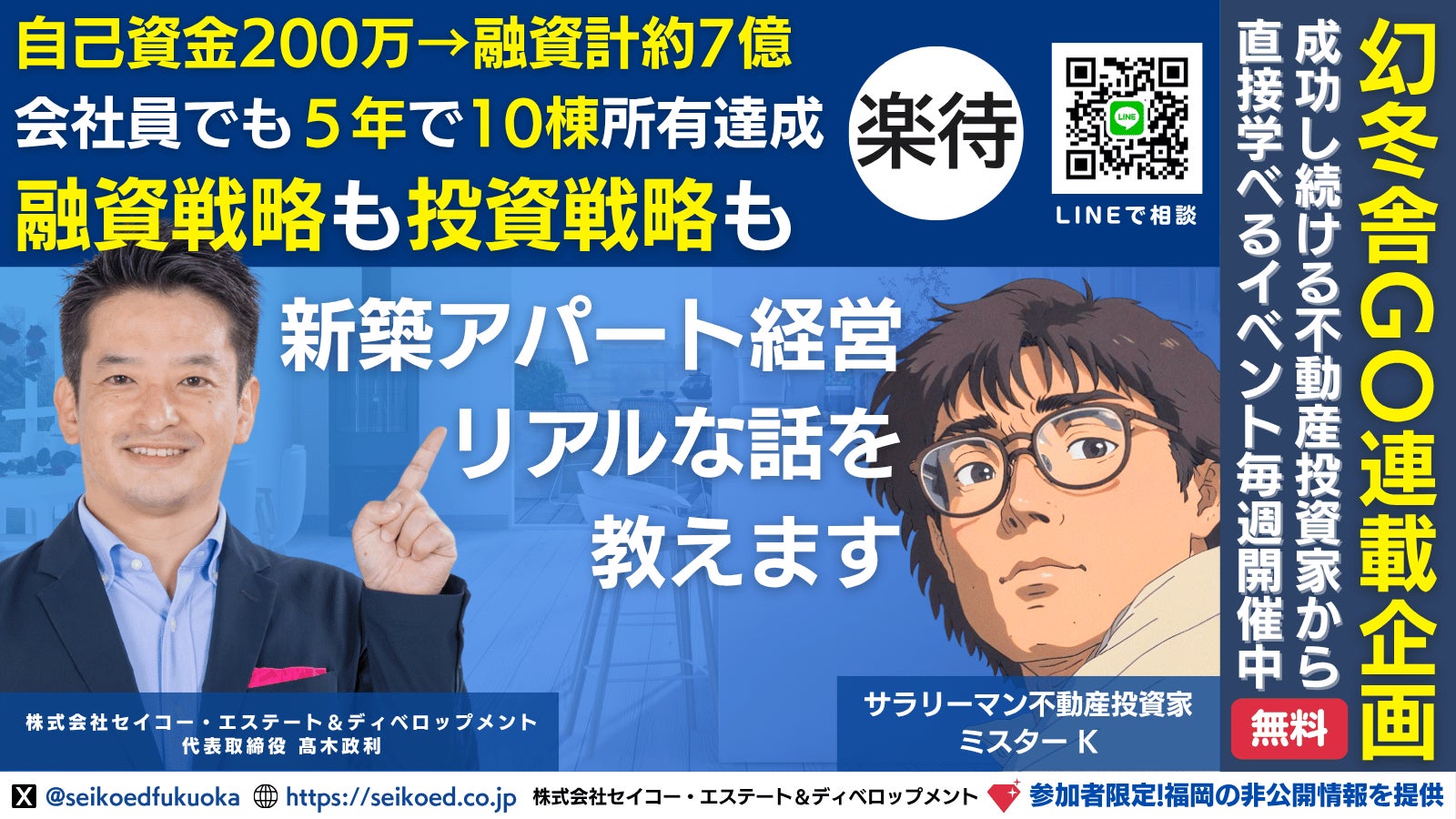 幻冬舎ゴールドオンラインに掲載されたセイコー・エステート&ディベロップメント代表高木の記事でも取り上げたサラリーマン不動産投資家ミスターKが講師で登壇する、セミナー第二段。
