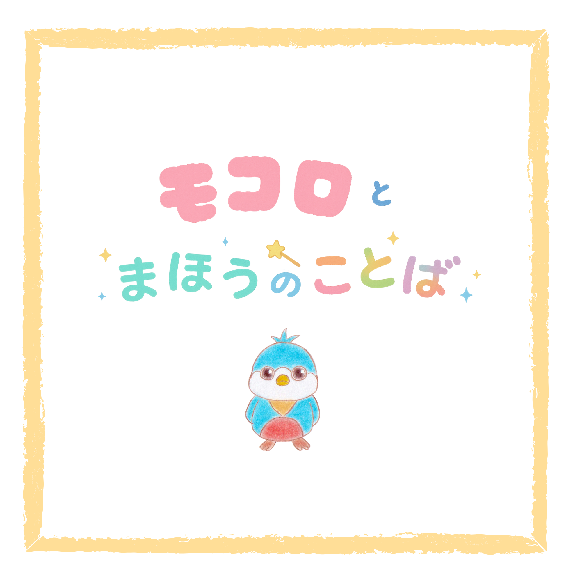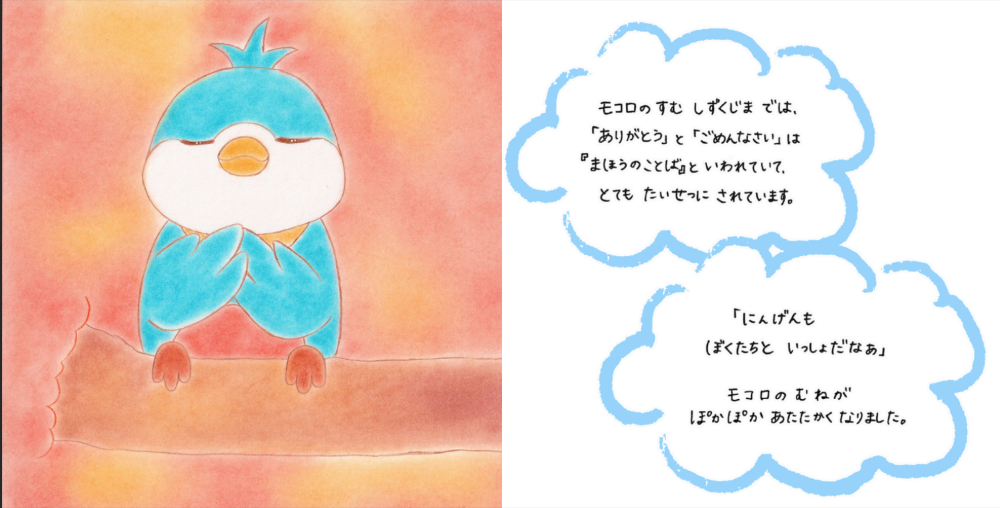 ストーリー:しずくじまに住んでいる「モコロ」は、ある日、人間界に遊びにきました。公園の上を飛んでいると、「ありがとう」と「ごめんね」を大切にする親子の会話が聞こえてきました。モコロの住むしずくじまでは、「ありがとう」と「ごめんなさい」は“まほうのことば”と呼ばれ、とても大切にされています。「人間の世界でも大切にしているんだ」そう気づいたモコロの心は、あたたかくなりました。その後も、街の中でたくさんの人たちが言葉を大切にしている場面に出会い、言葉の大切さを再認識したモコロは、元気にしずくじまへ帰っていきました。