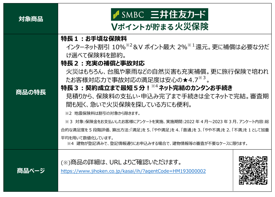 ※1 Vポイント最大2%還元となるためには、通常のカード利用でVポイントが1%還元となるカード等で保険料をお支払いした場合に限ります。その他のカードでは還元率が異なる場合があります。対象カード・対象の保険商品およびご注意事項の詳細はこちらを必ずご確認ください。