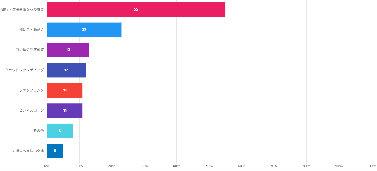 特に多く検討されている資金調達方法は「銀行・信用金庫からの融資(55%)」で、次いで「補助金・助成金(23%)」でした。銀行・信用金庫からの融資以外では、返済の義務がない国・自治体からの支援制度が資金調達の有力な選択肢となっていることが分かります。