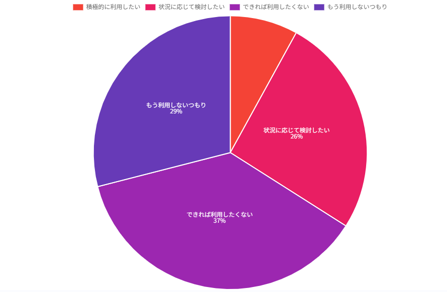 「できれば利用したくない(37%)」「もう利用しないつもり(29%)」と回答した経営者・役員が合計で半数を超えています。その理由としては「そもそも資金調達の必要がない」という回答の他に「内容がよく分からない」「借り入れをしたくない」「銀行融資で間に合っている」といった声がありました。