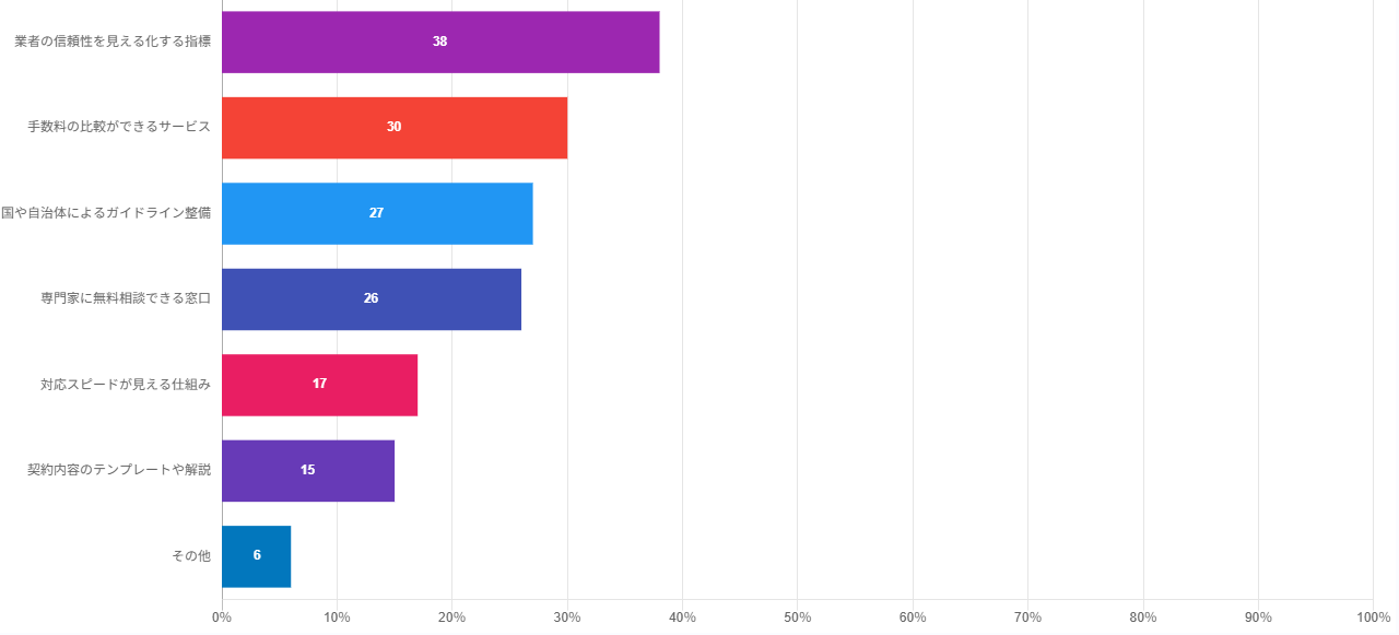 「業者の信頼性を見える化する指標が欲しい(38%)」という回答が、最も多い結果となりました。一口にファクタリング会社といっても、さまざまな会社が存在します。