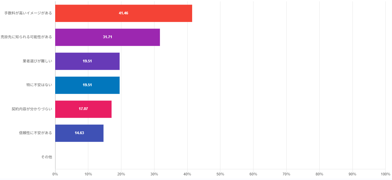 「手数料が高いイメージがある(41.46%)」という不安や懸念を感じている経営者・役員が最も多く、次に「売掛先に知られる可能性がある(31.71%)」「業者選びが難しい(19.51%)」という回答が続きました。
