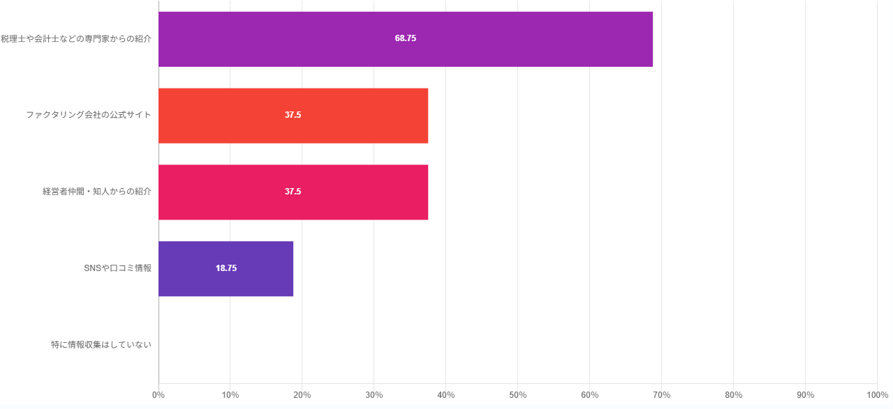 Q4の質問で「過去1年間にファクタリングを利用したことがある」と回答した経営者・役員に対して「ファクタリングに関する情報を得る際、どのような手段を活用しましたか?(複数回答可)」という質問をしたところ、以下の結果となりました。