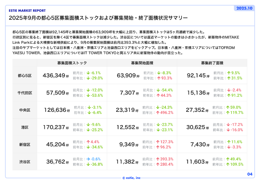 2025年9月の都心5区全体では、募集開始面積は前月比8.3%減の63,909坪、募集終了面積は前月比9.5%増の92,145坪となり、募集終了面積が募集開始面積を大きく上回りました。募集面積ストックは前月比6.1%減の436,349坪となり、5か月連続で減少しました。