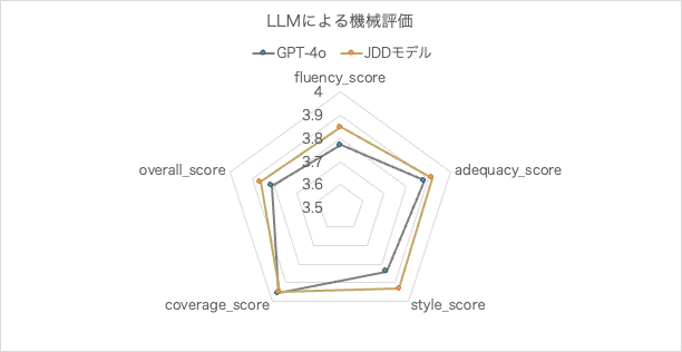 約4,500件の金融市場関連文章に対して、JDDモデルとGPT-4oそれぞれで翻訳文を作成。生成された翻訳文の各々に対して、GPT-4.1を利用して以下の5項目を4点満点でスコアリングさせた。