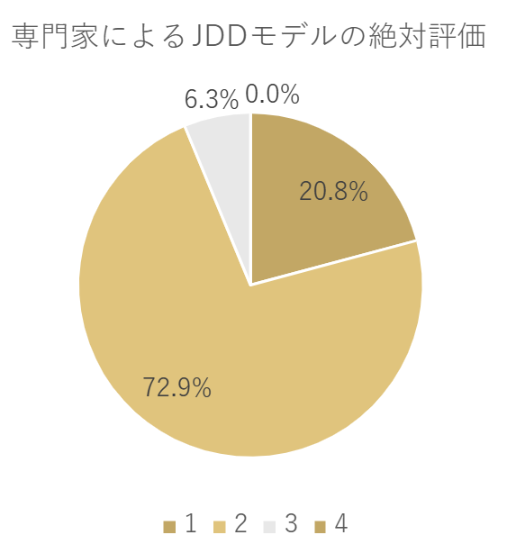 相対評価では約60%の割合でJDDモデルの翻訳がGPT-4oより優れているという評価、また絶対評価では93%の割合でJDDモデルの翻訳が、人間が多少修正するまたは全く修正しないまま業務で使えるとの判定となった。
