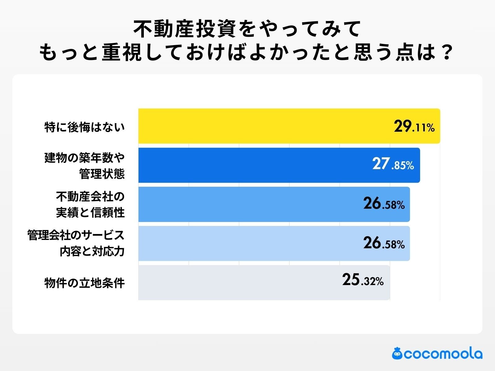 一方で、「投資を始める前にもっと重視すればよかった」と思う点では、「特に後悔はない」(29.11%)に次いで、「建物の築年数や管理状態」(27.85%)、「不動産会社の実績と信頼性」(26.58%)が並んだ。調査から、物件の物理的な状態や、長期的なパートナーとなる会社の信頼性を重視すべきという不動産投資サービス選びの注意点が見えてきた。