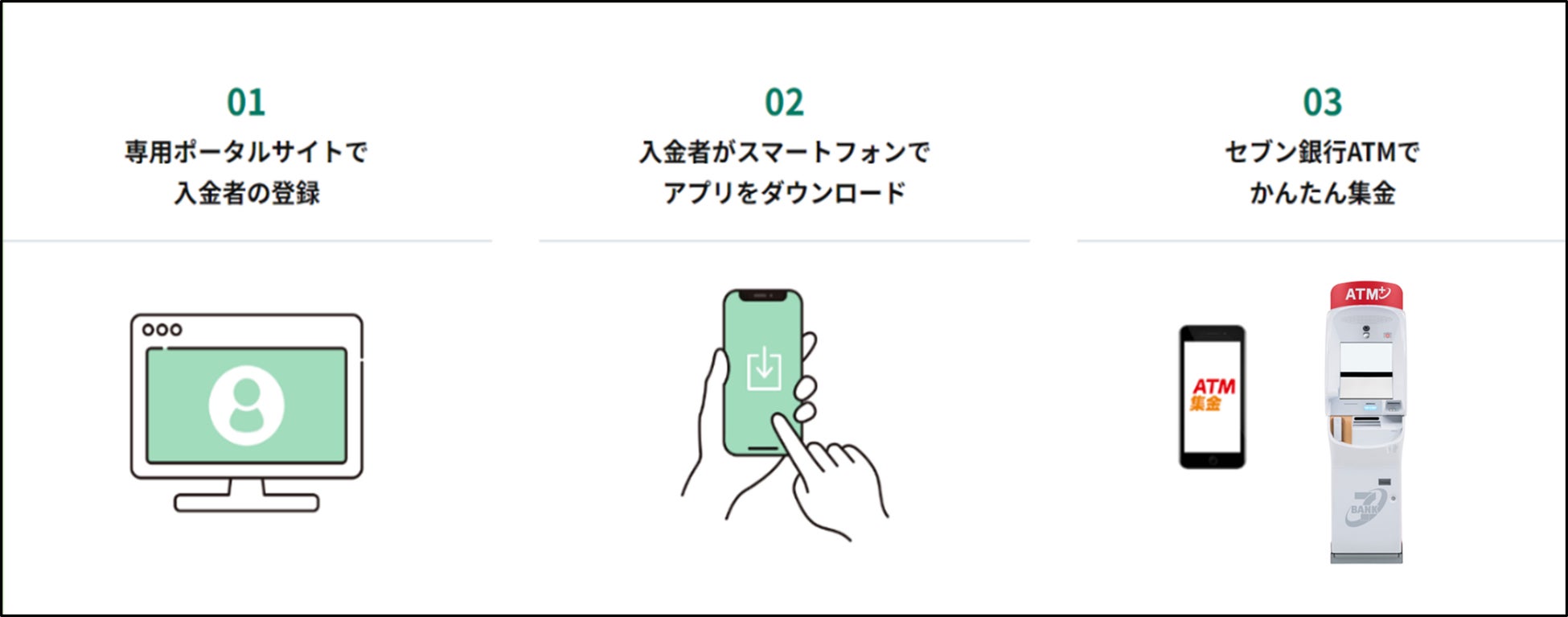 セブン・ペイメントサービスが提供する「ATM集金」は、専用スマートフォンアプリを用いて、セブン銀行ATMで原則24時間365日、売上金を入金できるサービスです。