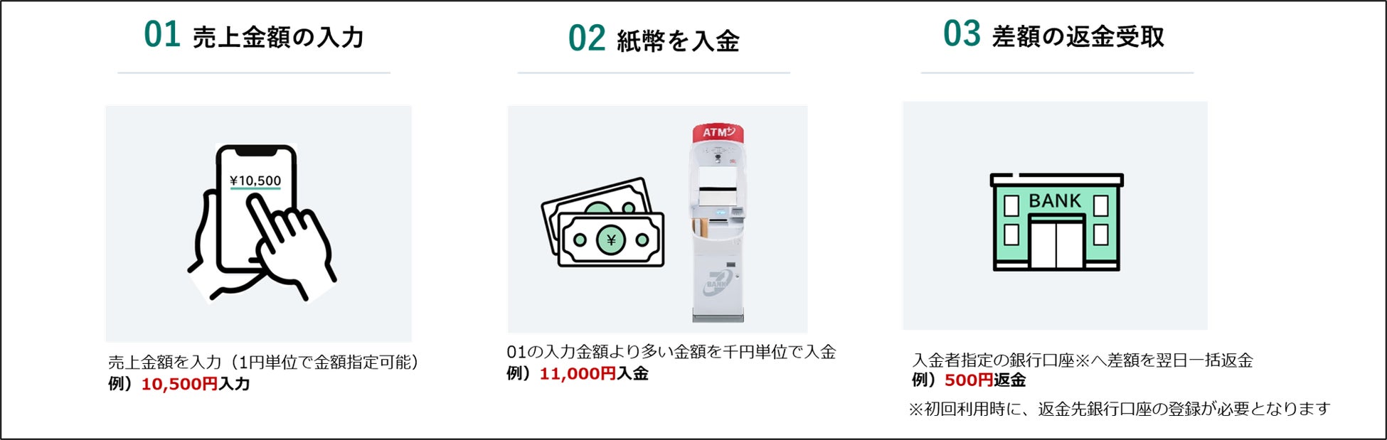 従来の「ATM集金」では、専用管理画面から千円単位で売上金管理が可能でしたが、このたびの新機能「1円単位集金オプション」により、硬貨分も含めた1円単位での売上金管理が可能となります。専用アプリに1円単位の任意の売上金額を入力し、入力金額よりも多い現金を千円単位で入金することで、差額を入金者指定の返金先銀行口座に返金するサービスです。