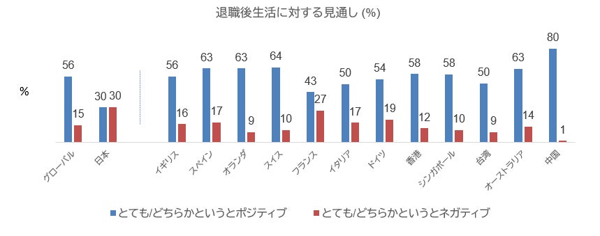 医療費や介護費用は、さまざまな国・地域において退職後の生活における不安要因として挙げられています。そのような中でも、「退職後の生活に対する見通し」について、退職前の日本人でポジティブと答えた人は30%にとどまり、グローバル平均(56%)を大きく下回っています。一方、ネガティブと答えた人は30%で、グローバル平均(15%)の2倍に達しました。これは、経済・健康・制度の不安が複合的に影響し、包括的なウェルビーイングが求められていることを示しています。