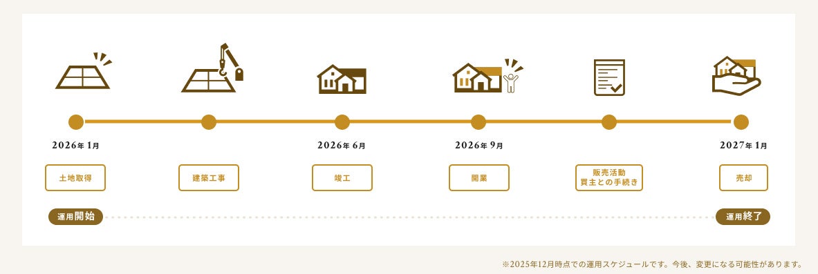 ファンド組成後、建築確認取得済みの土地を購入し、建物建築を行います。建物は2026年6月下旬に竣工予定です。竣工後、運営会社である株式会社AMATUHIと賃貸借契約を結び(フリーレント)、開業準備を行った後運営を開始します。