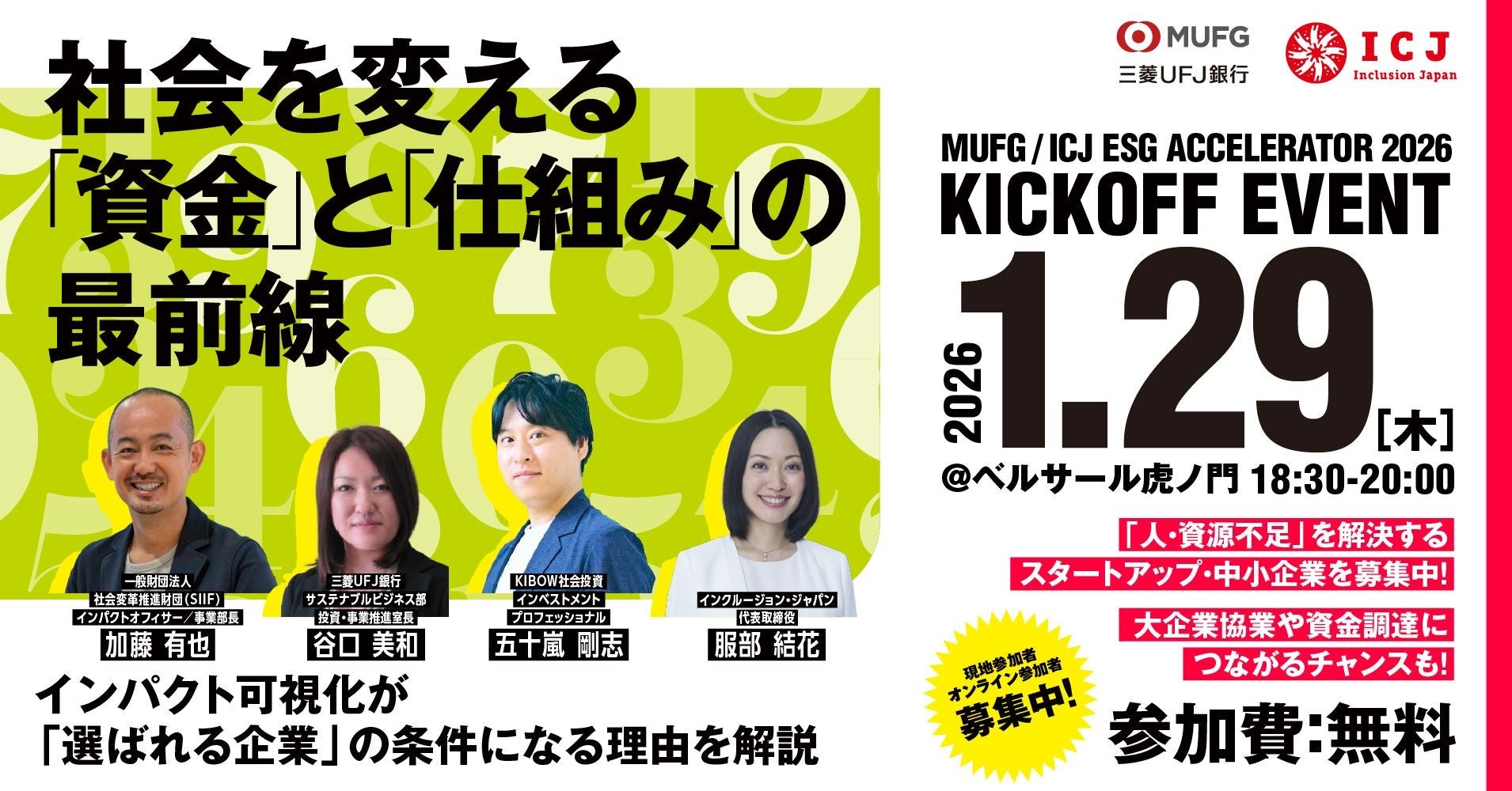 株式会社三菱UFJ銀行(以下、三菱UFJ銀行)と、ESG領域においてベンチャー投資・事業共創を行うインクルージョン・ジャパン株式会社(以下、ICJ)は、循環型経済に取り組むスタートアップ・中小企業の社会的インパクトを可視化し、大企業との協業の意思決定を加速するプログラム「MUFG ICJ ESGアクセラレーター 2026」を開催します。