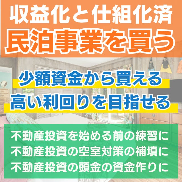田中の民泊投資では、収益化済み・運営実績のある稼働中の民泊事業を少額資金から買う方法から売却イグジット、資産拡大のための融資戦略まで民泊M&A投資の全てに対応しています。