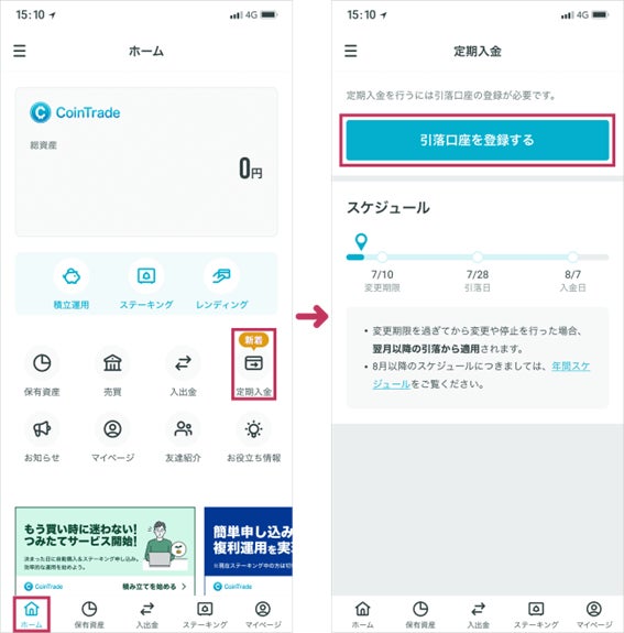 定期入金は、事前に引落する銀行口座を登録することで毎月の入金作業を自動化できる機能です。操作は簡単で、「CoinTrade(コイントレード)」アプリのホーム画面より、2タップで銀行口座登録画面まで進むことができます。一度登録するとお客様自身が毎月入金の手続きを行う必要が無く、決められた日時に決められた金額が「CoinTrade」口座へ入金されます。