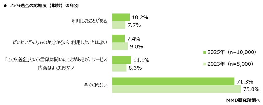 18歳~69歳の男女10,000人を対象に、ことら送金について聞いたところ、「利用したことがある」が10.2%、「だいたいどんなものか分かるが、利用したことはない」が7.4%、「『ことら送金』という言葉は聞いたことがあるが、サービス内容はよく知らない」が11.1%となり、認知度は28.7%だった。