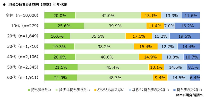 18歳~69歳の男女10,000人を対象に、現金の持ち歩きについて聞いたところ、持ち歩きたい意向(「持ち歩きたい」と「多少は持ち歩きたい」の合算割合)は62.0%、持ち歩きたくない意向(「なるべく持ち歩きたくない」と「持ち歩きたくない」の合算割合)は24.9%となった。