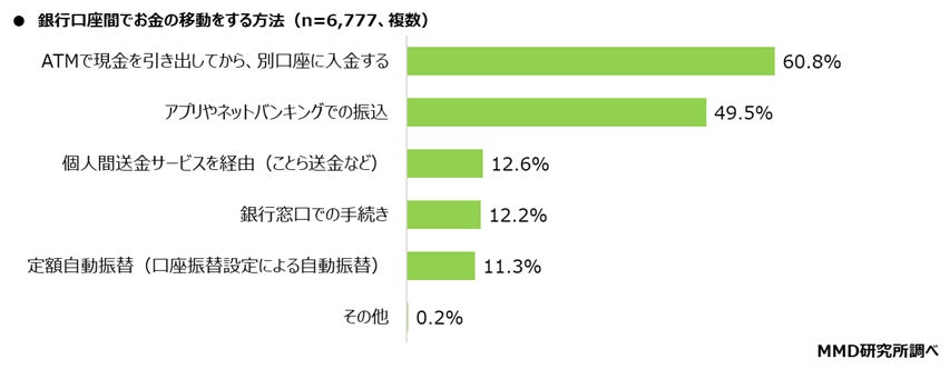 次に、銀行口座間でお金の移動をする6,777人を対象に、お金を移動する方法を聞いたところ(複数回答可)、「ATMで現金を引き出してから、別口座に入金する」が60.8%と最も多く、次いで「アプリやネットバンキングでの振込」が49.5%、「個人間送金サービスを経由(ことら送金など)」が12.6%となった。