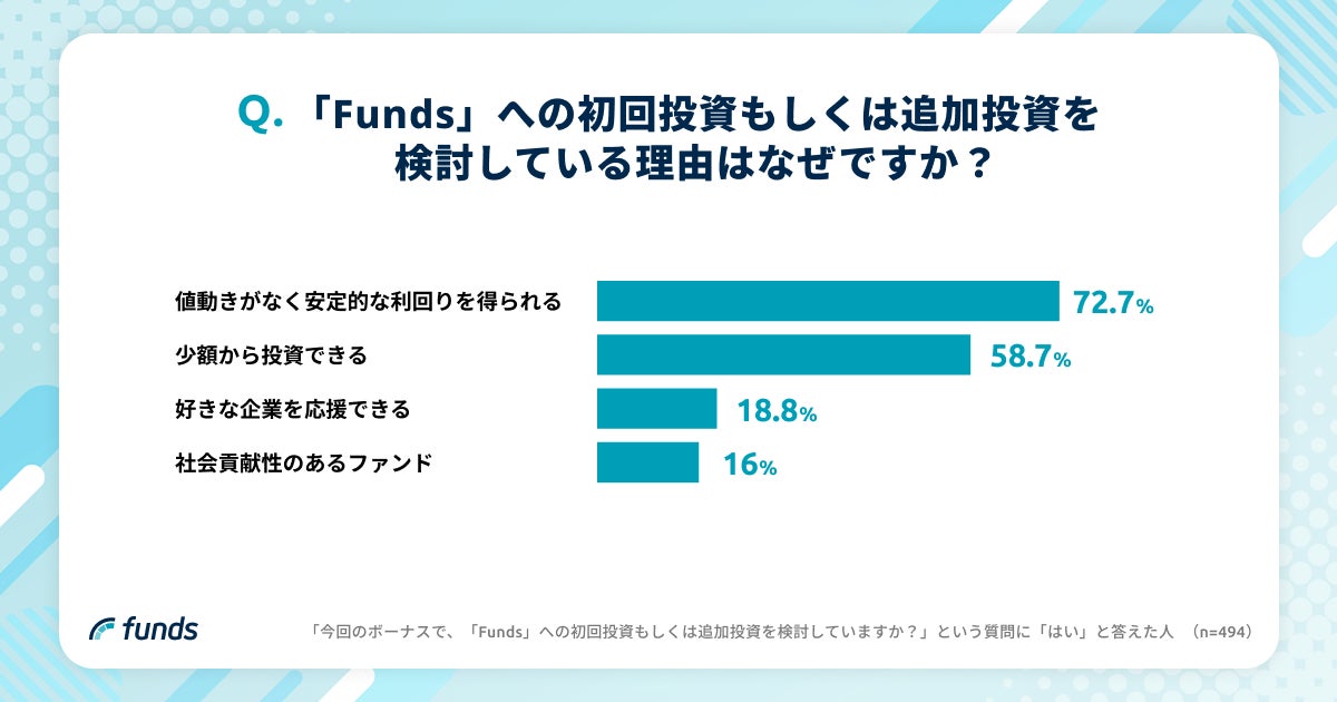 投資を予定している回答者のうち、41.4%が今回のボーナスで「Funds」への初回投資もしくは追加投資を検討していると回答しました。Fundsを選ぶ理由としては、「値動きがなく安定的な利回りを得られる」(72.7%)が圧倒的多数となり、投資における「安定性」と「手軽さ」を重視する投資家ニーズが確認されました。