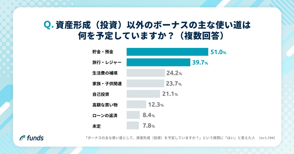 投資以外の主な使い道としては、「貯金・預金」(51.0%)、「旅行・レジャー」(39.7%)が続きました。