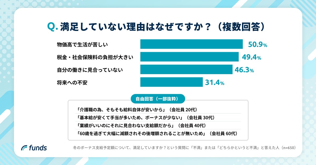 ボーナス支給予定額について「不満」「どちらかというと不満」と回答した層は計46.5%。その理由として、「物価高で生活が苦しい」(50.9%)に次いで、「税金・社会保険料の負担が大きい」(49.4%)が「自分の働きに見合っていない」(46.3%)を上回りました。
