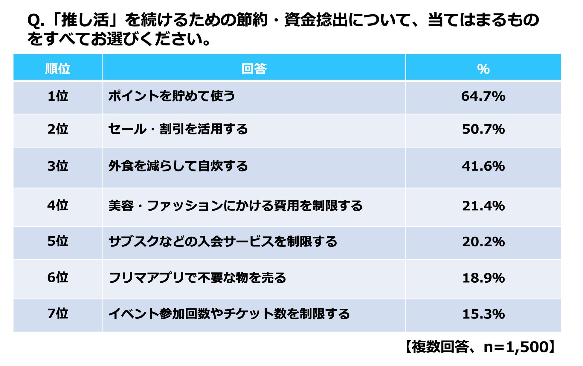 現在推し活のための貯金をしているか聞くと、全体の3割以上(35.3%)が「推し活のための貯金をしている」と回答。加えて、推しを守るための資金捻出の手段について聞くと、「節約」をしている人が62.7%、「投資」をしている人が34.5%、「副業・アルバイト」をしている人が21.6%となり、その具体的な方法では、1位から順に「ポイントを貯めて使う(64.7%)」、2位「セール・割引を活用する(50.7%)」、「外食を減らして自炊する(41.6%)」となりました。