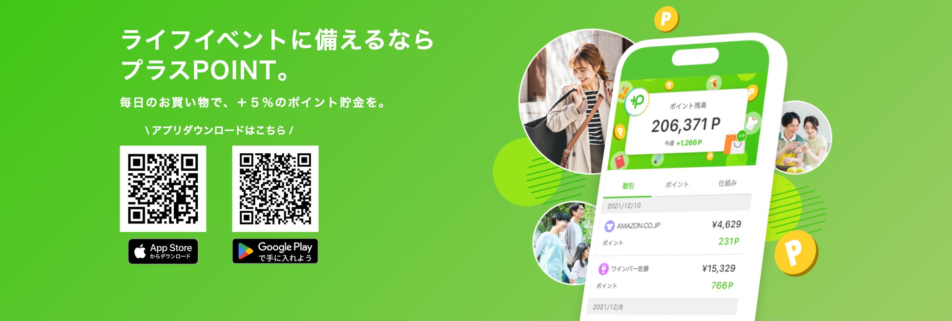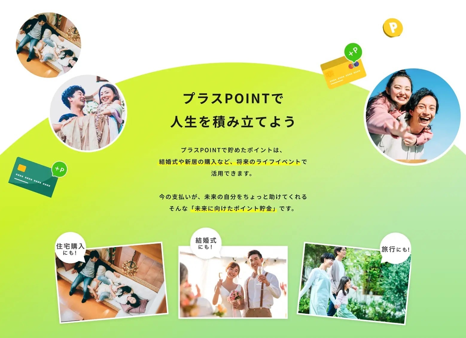 「プラスPOINT」は、日本中のあらゆるクレジットカードの利用に対し、追加で5%のポイントを上乗せするライフイベント特化型の新しいポイントサービスです。