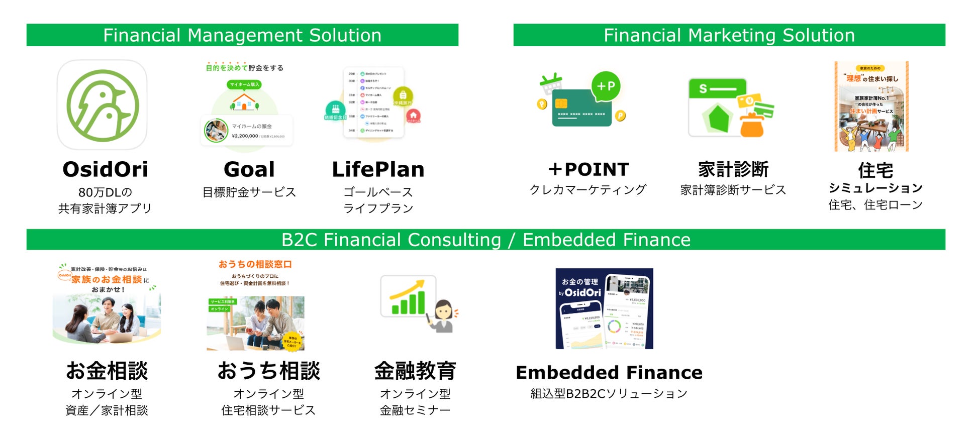 家族の未来を構築するゴールベースアプローチの「ライフプラン」や目標貯金サービス「Goal」、住宅購入支援サービス「理想の住まい探し」、お客様のお金の総合相談窓口「家族のお金相談」、金融機関様向けEmbedded Financeサービスの「OsidOri for Bank」などの提供及び運営実績があります。